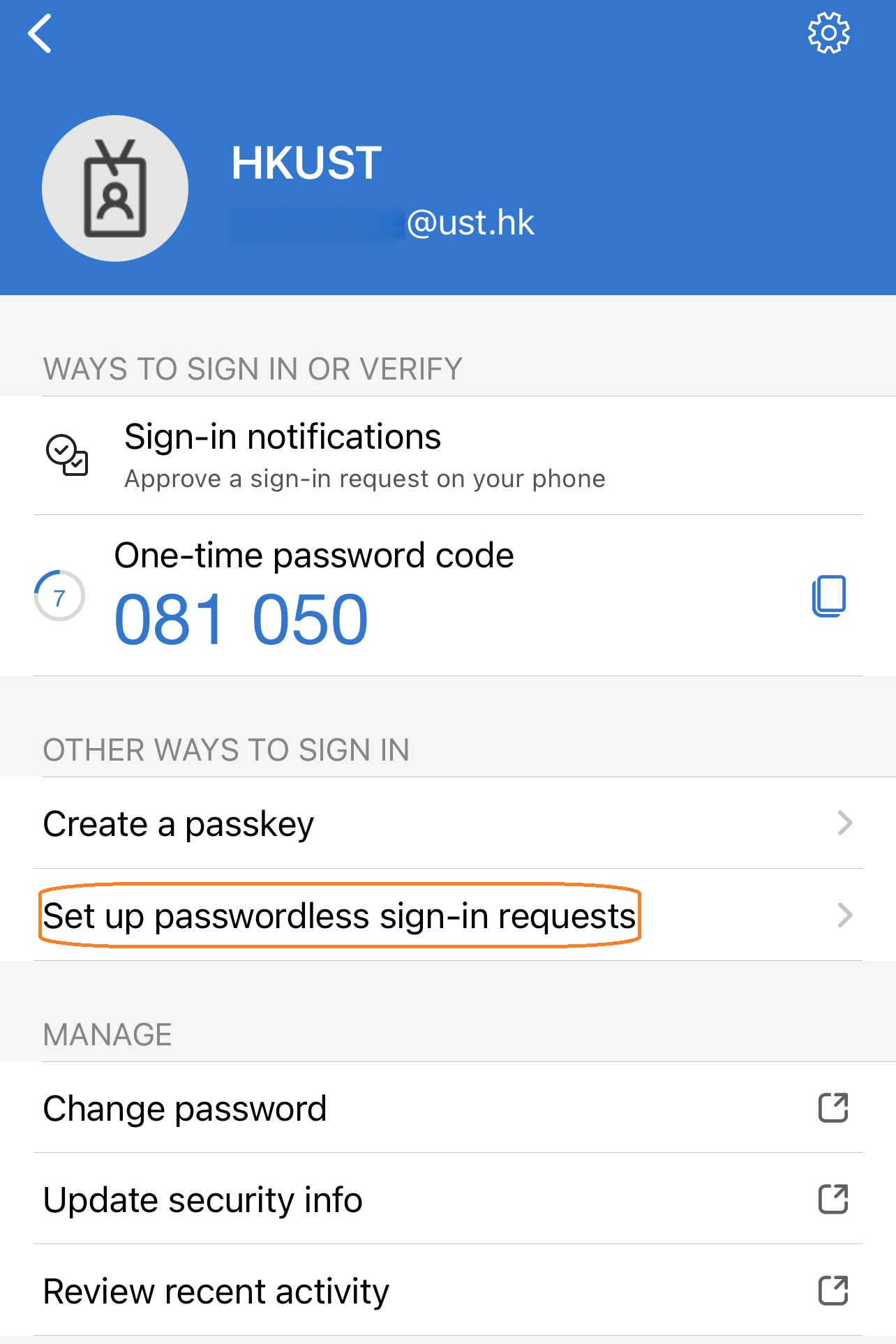 - Select "Set up Passwordless sign-in requests" and enter your account password.